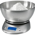 Электронные, предел взвешивания 5 кг, точность измерения +/- 1 г, объем чаши 2 л, материал платформы / чаши: сталь, тарокомпенсация, автоматическое выключение